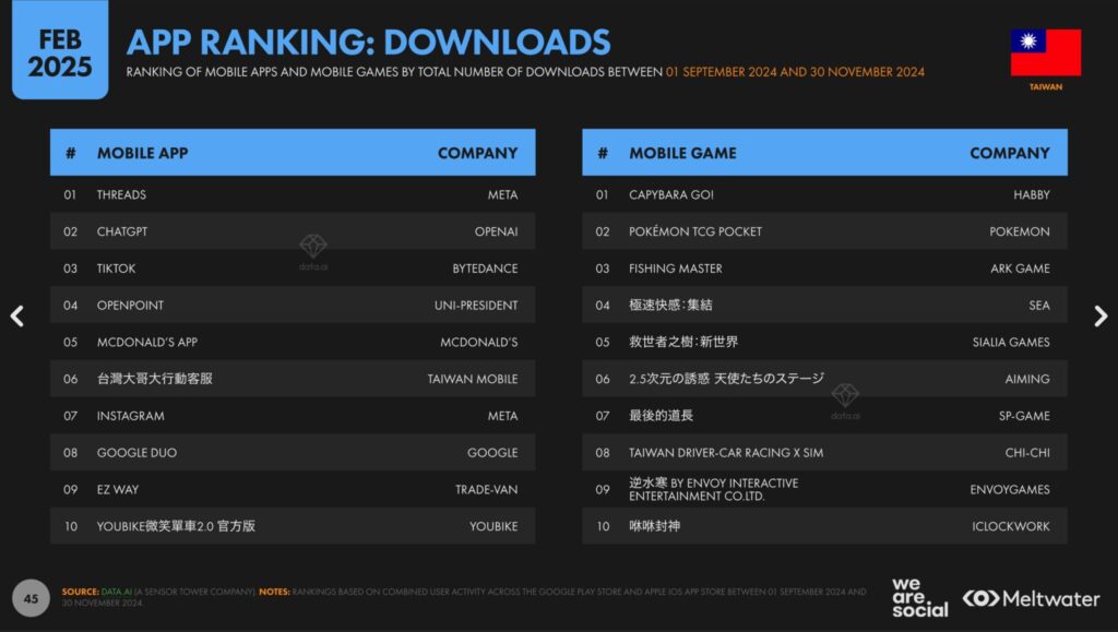 去年はランクにも入っていなかったThreadsが、たった1年でここまで台湾でユーザーを増やしているのは非常に興味深いです。