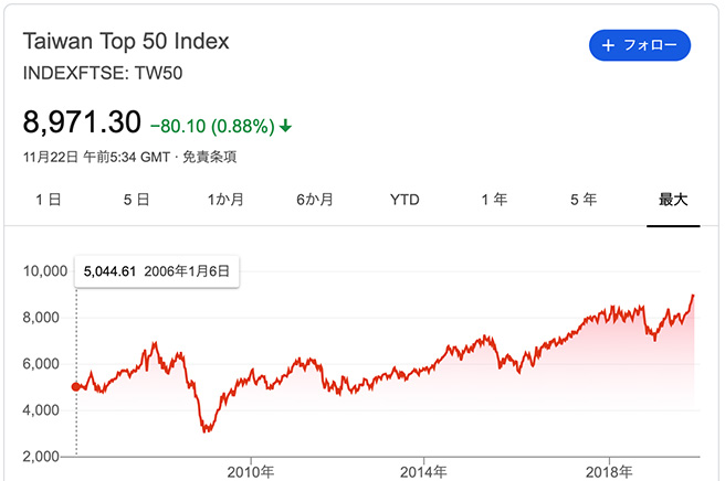 この TW50 を見れば、台湾の株式市場が過去数年でどのように推移したか大体わかります。(以下 Google のスクショ)