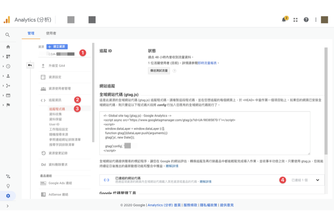 如果你的網站是透過全域代碼 (gtag.js) 的方式安裝 GA,你需要確認原本的通用 GA 資源是否已經連結評估 ID。前往 [管理] > [追蹤資訊] > [追蹤程式碼] 中,查看 [已連結的網站代碼]。如果已經連結上了,就不用進行額外的設定。